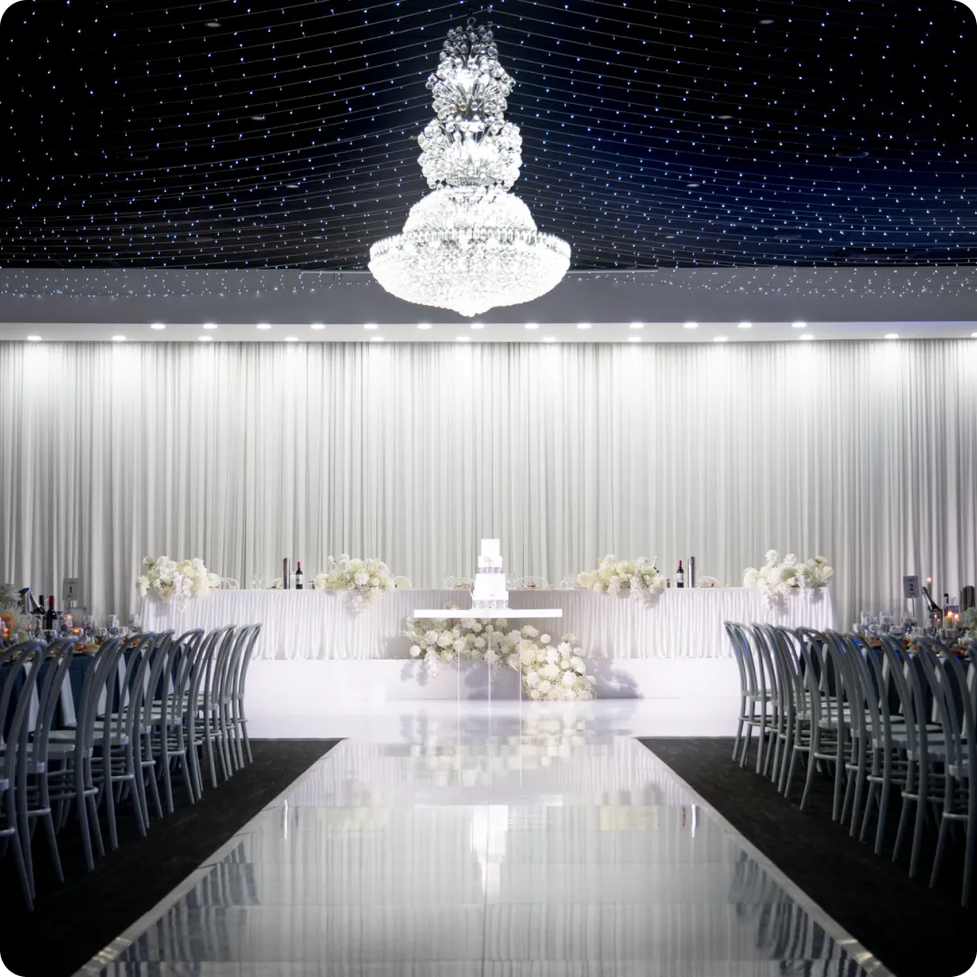 Bentwood chairs, linen options, fairy lights, chandelier features, table setups, and a raised bridal stage come included.